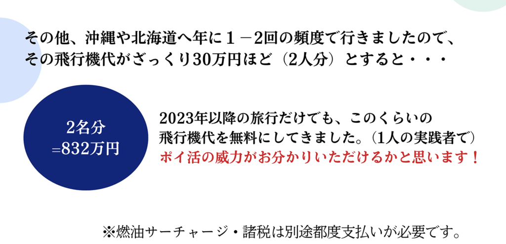 お金ではなくても飛行機に乗れることや、色々な旅行のためのお役立ち情報をたくさん教えていただき、今年は宮崎、名古屋、沖縄と、あちこちに旅行に行くことができました。
